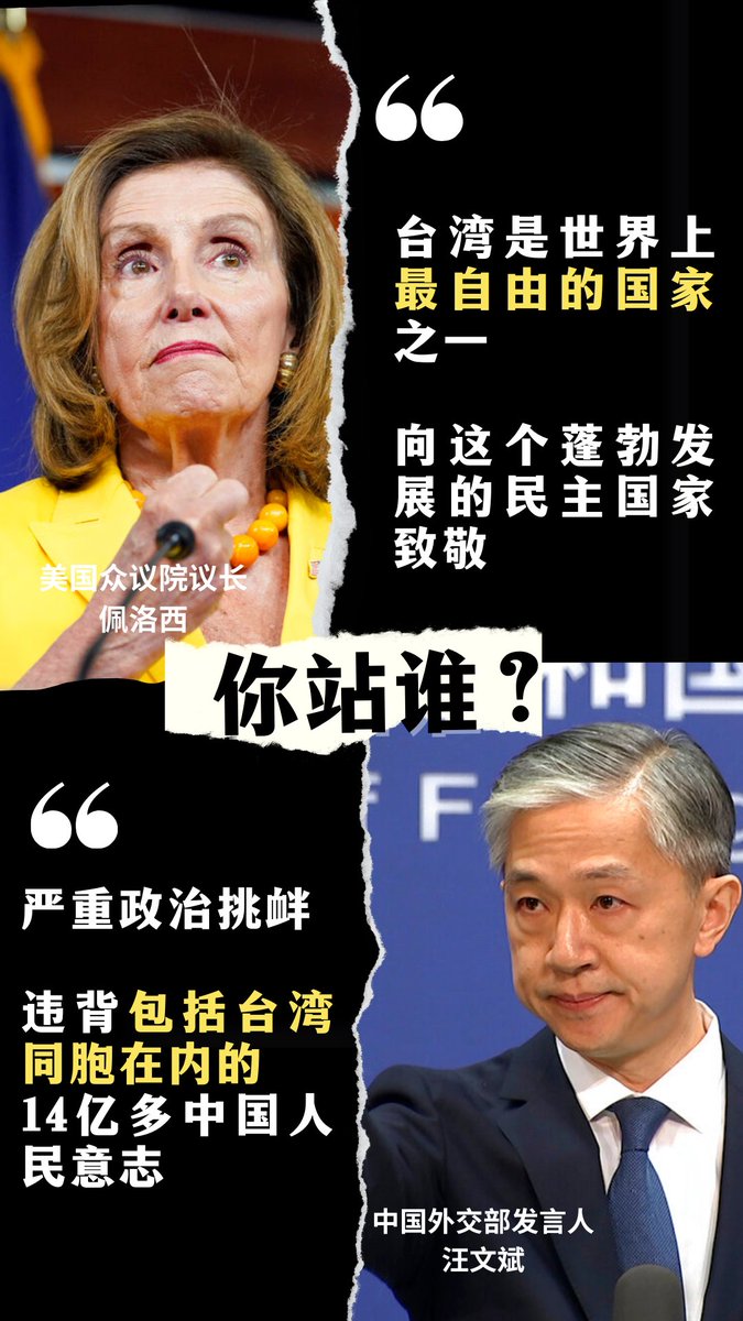 美国众议院议长 #佩洛西 台湾之行后,赞“台湾是世界上最自由的国家之一”。对此,中方如何评论?你站谁?
