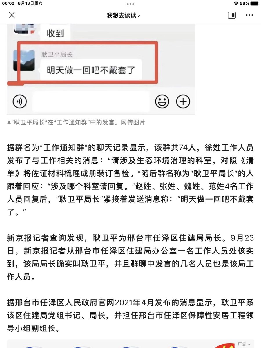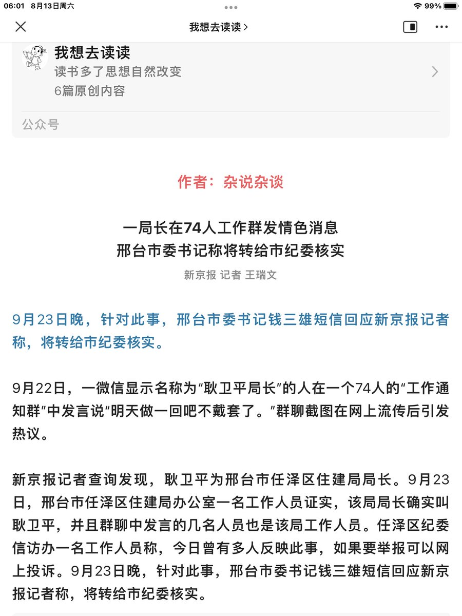 转【一局长在74人工作群发情色消息】邢台市委书记称将转给市纪委核实……