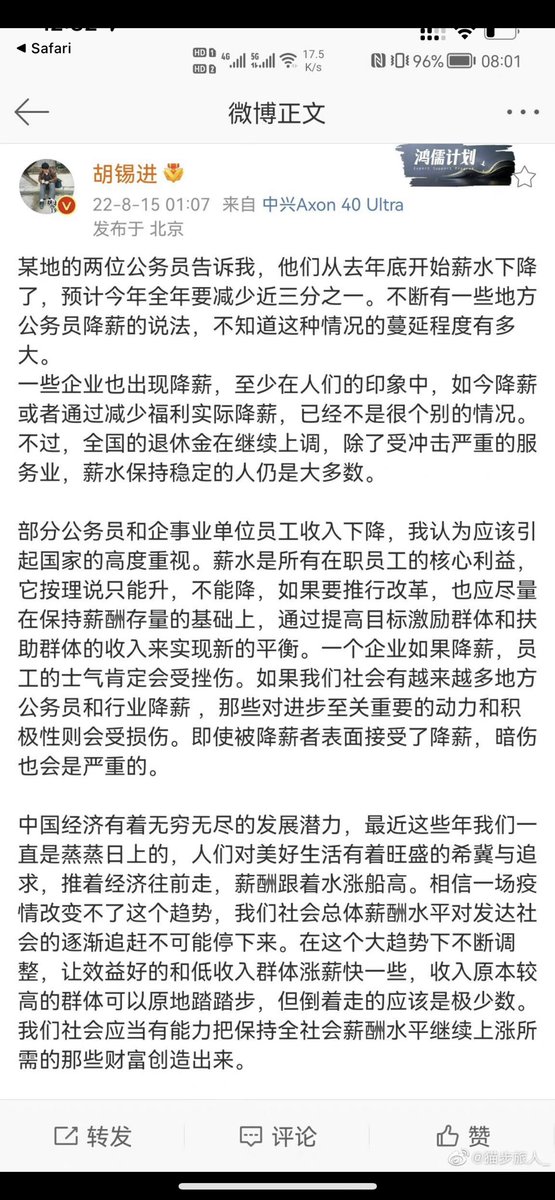 胡锡进为公务员降薪鸣不平。结果不到几小时就全网404了。老胡果然一触及自己利益就出来叫唤了。不过还是逃不过铁拳