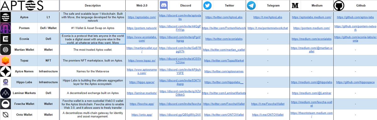 Aptos生态项目信息整理表格,还挺全的。感谢分享,高手在民间!