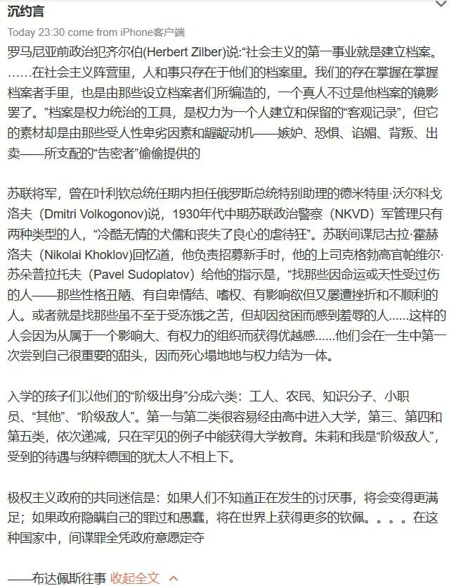 罗马尼亚前政治犯齐尔伯说:“社会主义的第一事业就是建立档案。……在社会主义阵营里,人和事只存在于他们的档案里。我们的存在掌握在掌握档案者手里,也是由那些设立档案者们所编造的,一个真人不过是他档案的镜影罢了。