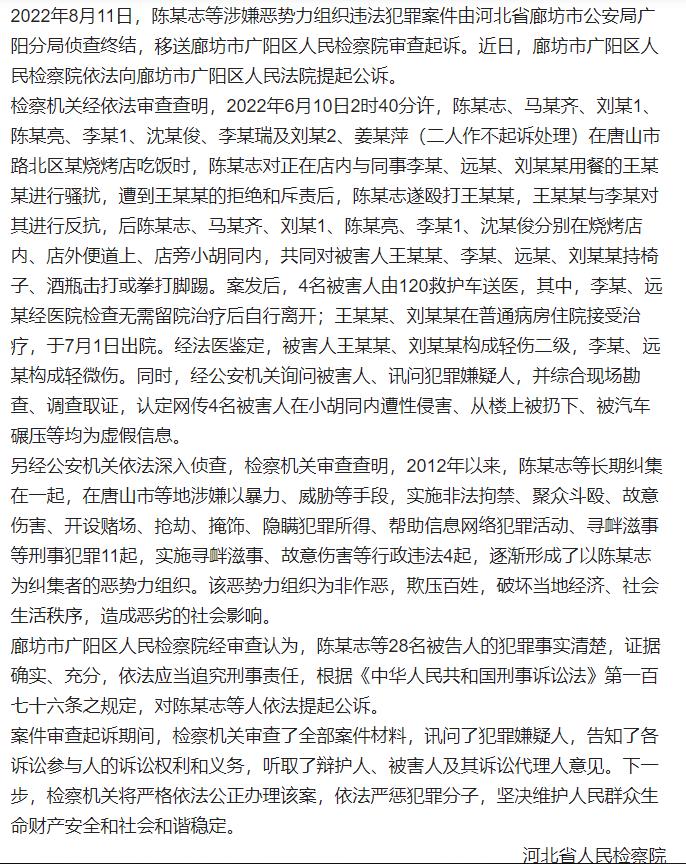 唐山打人案陈某志等7人被起诉 2名受害人已出院,保护伞被查