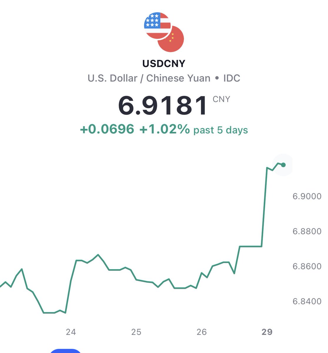 注意:人民币兑换美金不停的贬值中,快破7了。