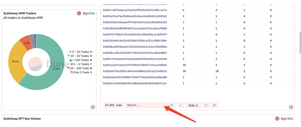 sudoswap数据,图片里搜索自己的地址,可以查到自己的地址买卖了几次,建议次数刷到2次以上,成为少部分地址。