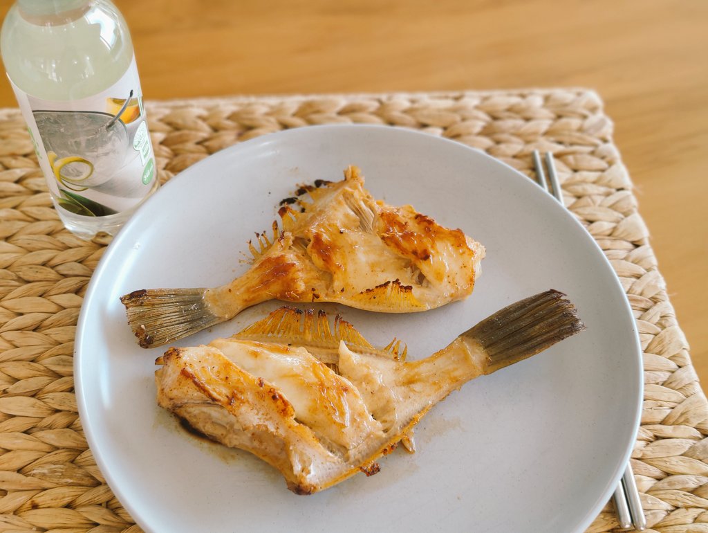 推友的推突然提醒了我 冰箱里还有两天前买的鱼 还好没有变质 赶快煎一下当午餐 这鱼有个好玩的名字叫皮夹克 因为砂纸般厚厚的鱼皮可以从尾巴那里一下子脱下来 煎鱼时查理全程厨房陪伴 吃鱼时也是