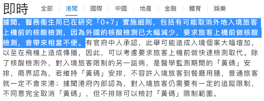 星岛:香港医务卫生局正研究“0+7”(入境人士不需酒店检疫,只进行七天医学监测)实施细则,包括取消外地入境旅客上机前的核酸检测。原本预计“0+7”在10月19日特首李家超的首份《施政报告》中推出,现有政界人士预计会在9月内公布。