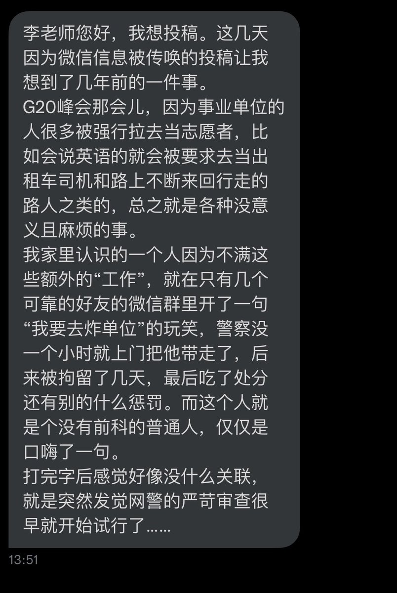 网友投稿,其实2016年杭州G20时候对微信的监控就已经如此了,只不过现在运用的范围更广了。因为太过离谱我还专门找杭州本地的体制内朋友问了一下,确有其事,还说了些更夸张的,这里就不发了。