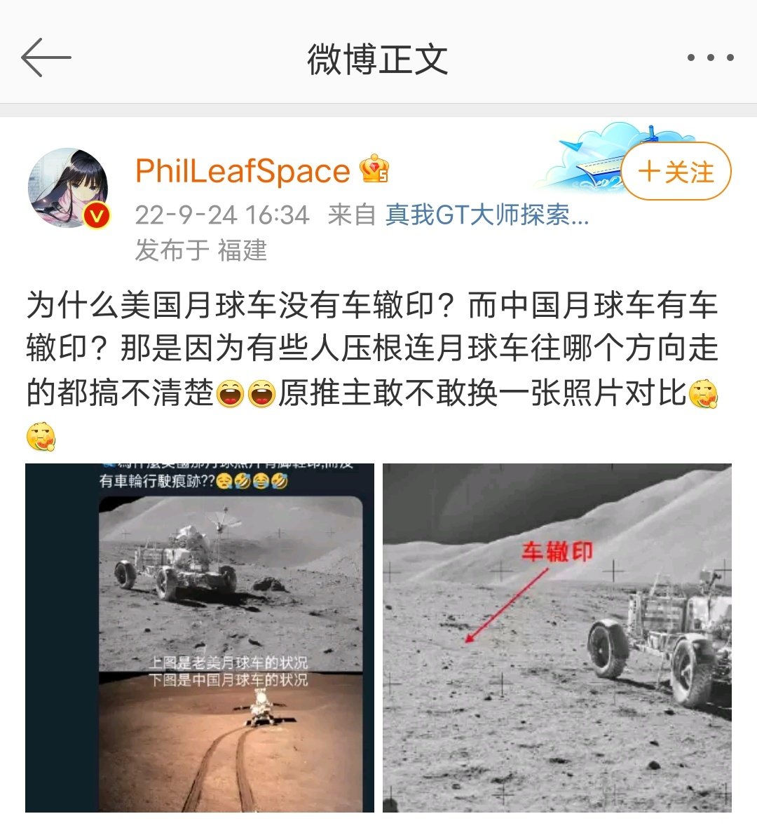中国驻大阪总领事转发了一条质疑美国登月造假的推文,遭墙内网友嘲讽。有人指出第一张照片经过了裁取,美国的登月车的后方明显可见两道车辙印。堂堂外交官如此水平,搞阴谋论,令人捧腹。