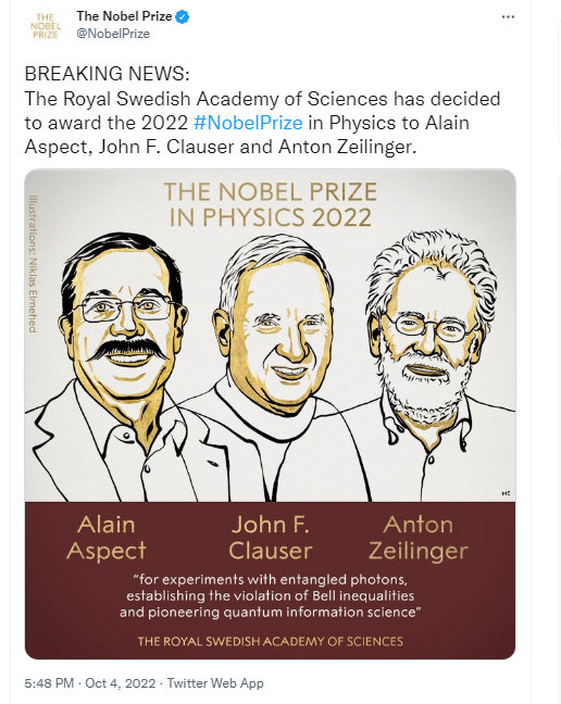 2022年诺贝尔物理学奖刚刚揭晓根据诺贝尔奖官网10月4日发布的消息,2022年诺贝尔物理学奖颁发给阿兰·阿斯佩、约翰·弗朗西斯·克劳泽、安东·塞林格,以表彰他们在量子力学方面的工作。
