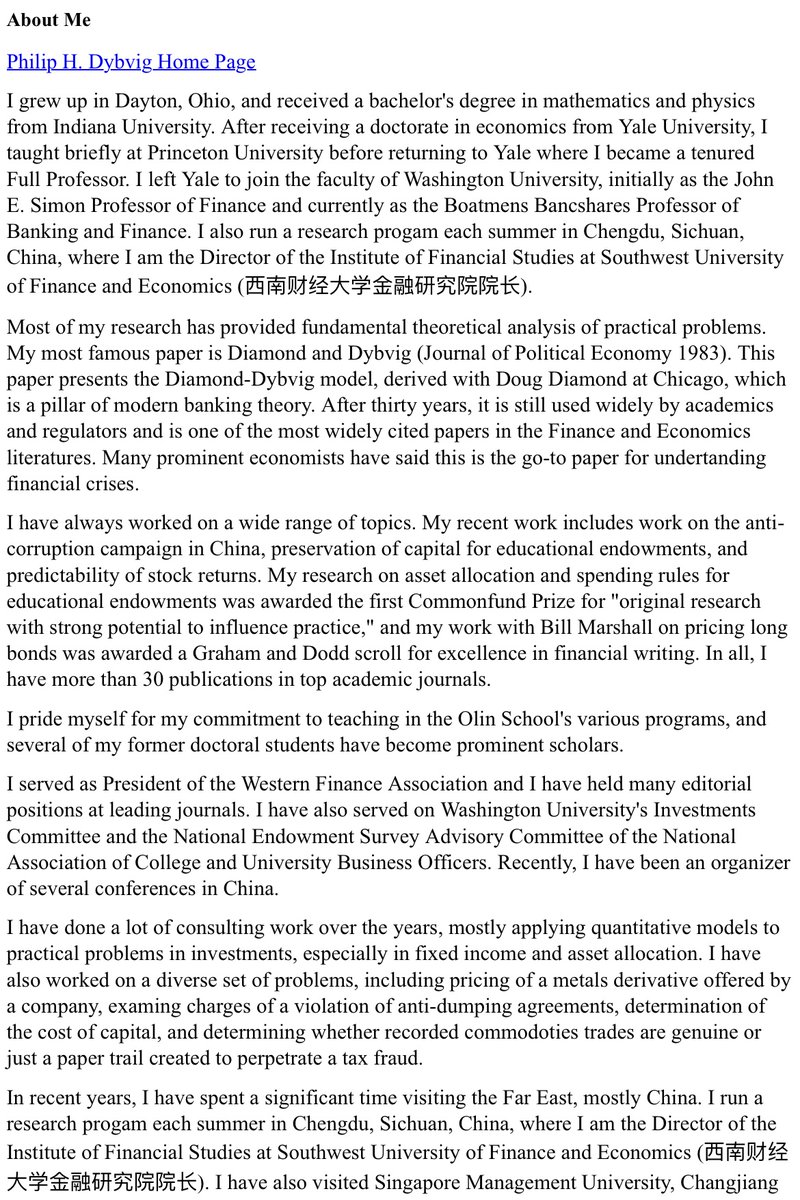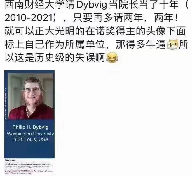 Phil Dybvig是今年的诺贝尔经济学奖得主之一,前面被西南财经大学金融研究院辞退了,据说是没通过教育部双一流考核。他在西南大学是实际到位的聘用,不是那种挂名,他自己官网的简历也明确讲了这个认知。
