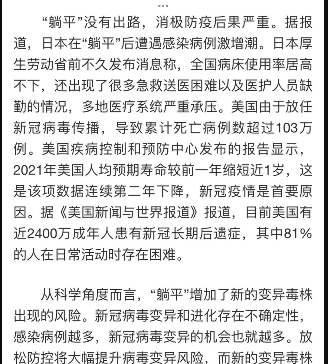 此官文把防疫爱好者的观点集中了一遍先是关爱老人(孩子)然后开始巴拉巴拉美国死100万日本医疗崩溃进而暗示都是外国不清零搞得病毒不停变异最后骄傲一下我们清零是因为我们有能力,外国拉垮做不到总结:赢麻继续偷乐