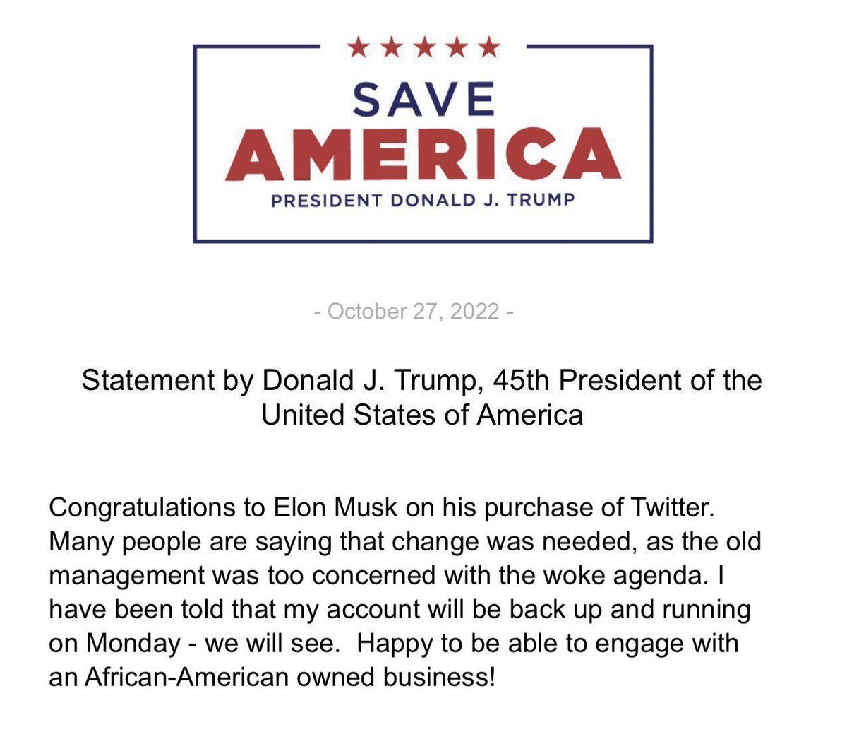 马斯克一完成推特收购,川普就迫不及待地宣布他被告知他下周一将回推特(不知是他编的还是真被告知)。几个月前他还说他要坚持他的“真理社交”,请也不回推特呢。看来“真理社交”办不下去了。他如果在选举日之前回推特大放厥词其实对共和党不利。