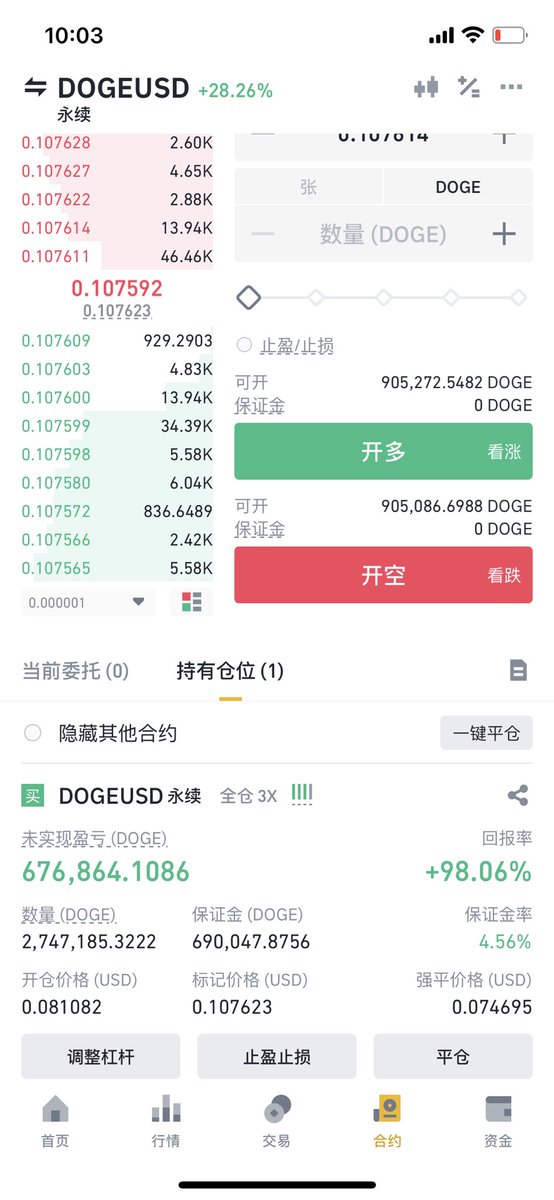 浮云最新情况是1万dogo大约98万个dogedoge本位盈利98倍u本位按600u算目前107000u约178倍