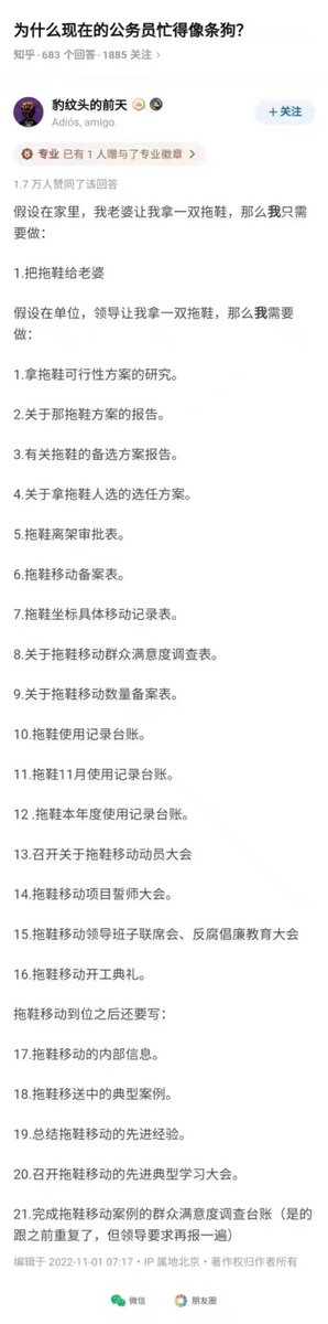 段子为什么现在的公务员忙得像条狗?转【老婆和领导的区别】假设在家里,我老婆让我拿一双拖鞋,那么我只需要做:把拖鞋给老婆假设在单位,领导让我拿一双拖鞋,那么我需要(21道工序) ……