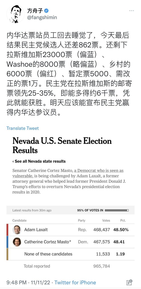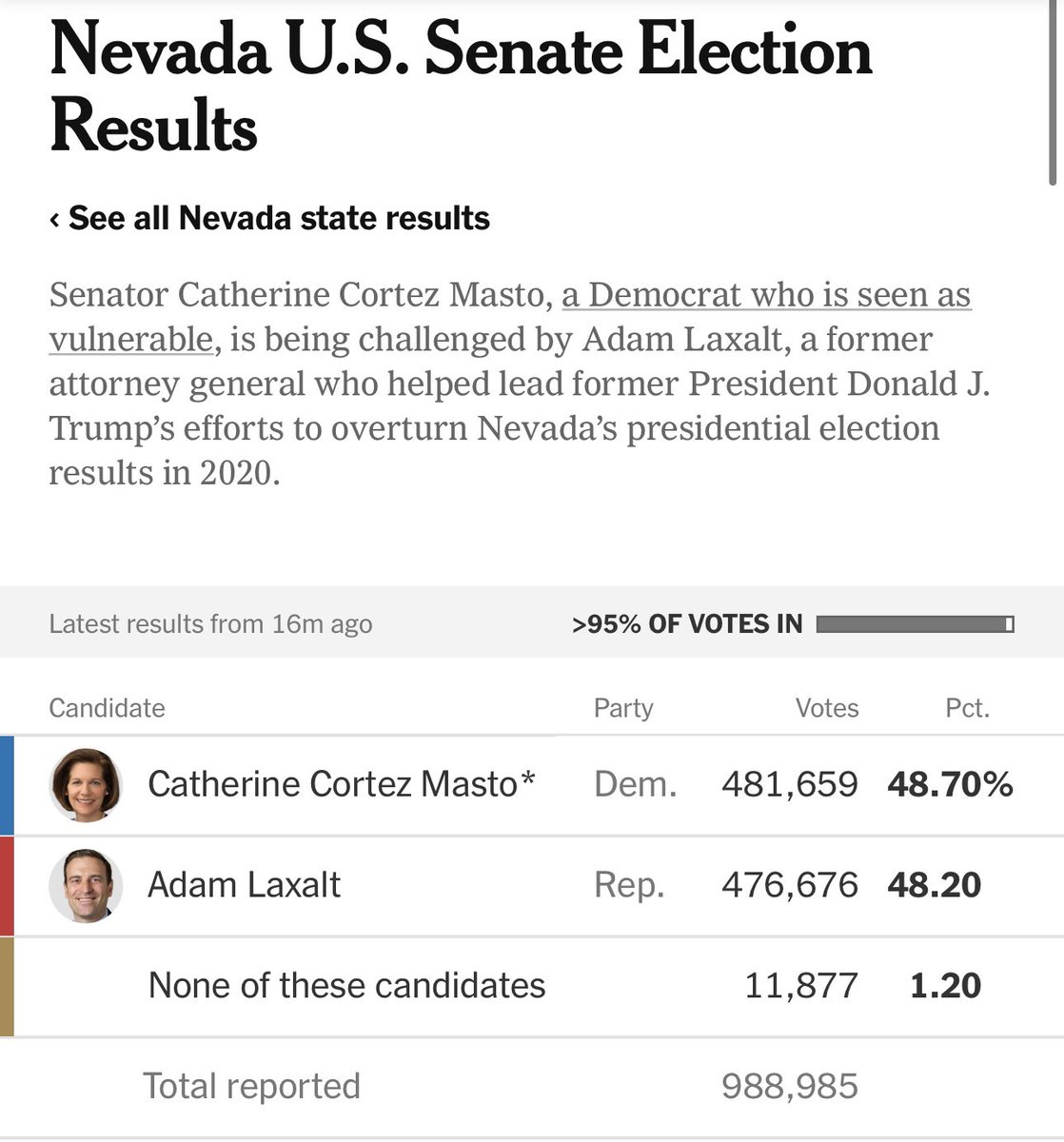见证奇迹的时刻:拉斯维加斯的邮寄票点完了,参议员民主党候选人多得约6千票,反超共和党候选人4983票,与我昨天的估计一样。后面还有Washoe的票,民主党占优,差距只会越拉越大,民主党正式保住了参议院。