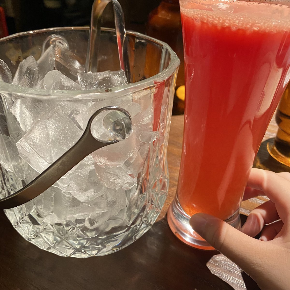 我说:给我来点冰块配汁,结果给我这么大一桶