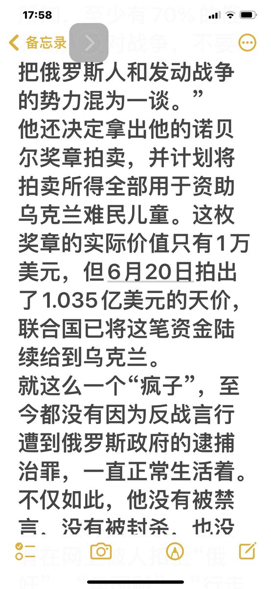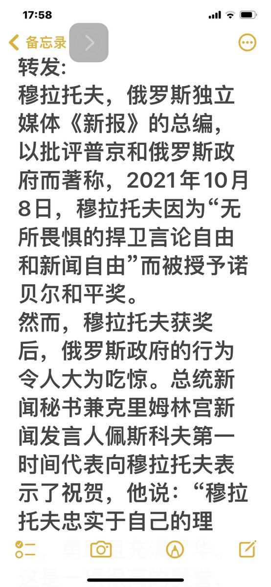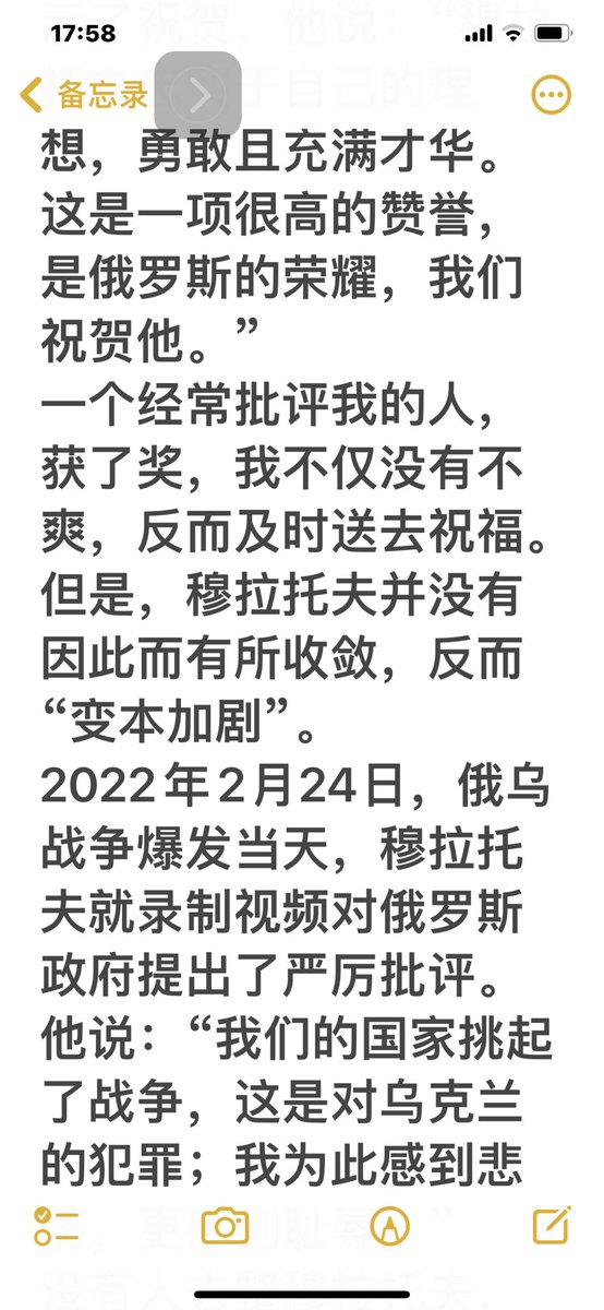 2021年获诺贝尔和平奖得主是俄罗斯的媒体人穆拉托夫。他一直抨击政府,一直反战,并拍卖了价值1万美元的和平奖章至1035亿美元,全部捐给乌克兰。重点是他安然无恙。从这点说,普京和习近平不可同日而语。俄国和中共国不可同日而语。