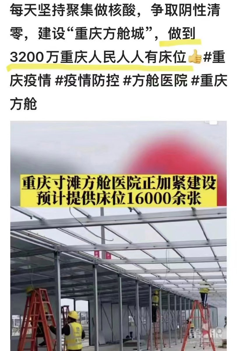 重庆自己也在建集中营,“寸滩方舱医院正加紧建设,预计提供床位16000余张,做到3200 万重庆人民人人有床位”,重庆领导的小学数学是谁教的?