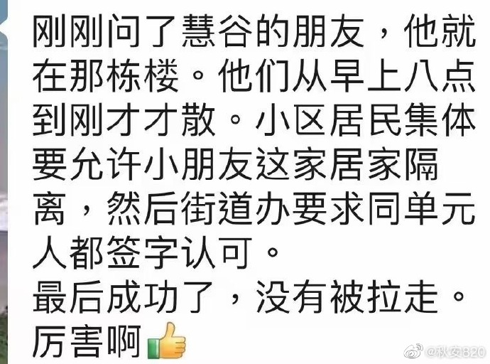 ——近日,北京慧谷阳光一位2岁孩子核酸阳性,父母为了不拖累邻居,穿好防护服准备带孩子去方舱。邻居们纷纷赶来,劝阻他们一家留下“我们一起想办法”。最后孩子留在家里隔离。