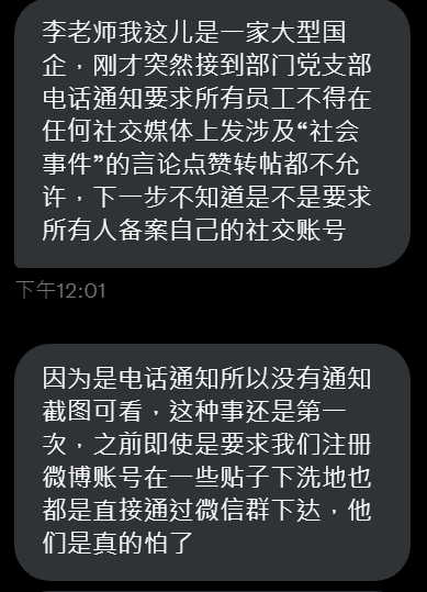 有网友投稿称 国企现在也下达通知,禁止员工不得在网上涉及社会事件