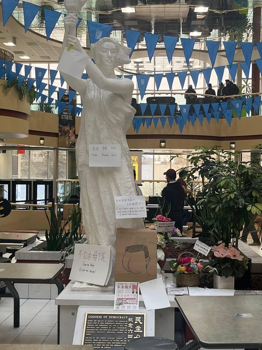 本以为卡加利现在太冷,没有人会响应各处的示威。结果有学生给我发来图片,看到卡加利大学学生会食堂的民主女神像前各种标语和花束中国留学生越来越多醒悟者了
