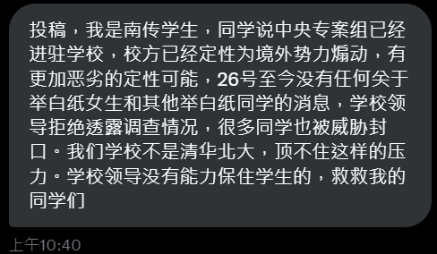 中央专案组进驻南京传媒学院。学生抗议活动被定性为境外势力煽动。