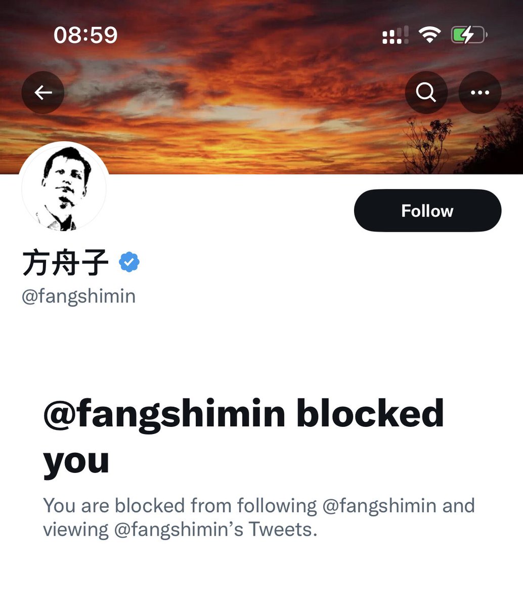 突然想起来了,大概几天前,我给方舟子的推下留言“方老师,您是大V,大肚些”,他直接拉黑了我,而且速度之快。