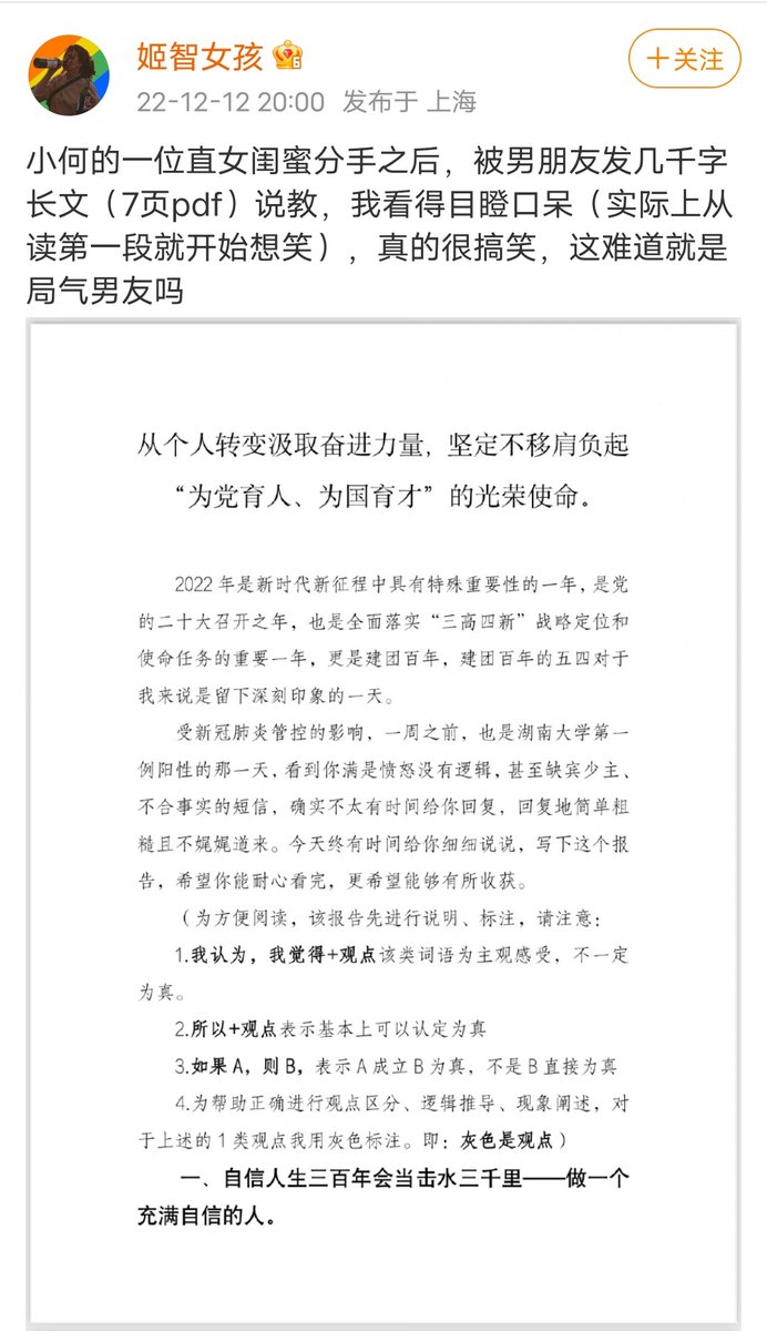 一名网友分享的男友送她的一封分手信,光看标题就目瞪口呆。这就是传说中的厅局气?这是交了个王沪宁当男朋友吧😅
