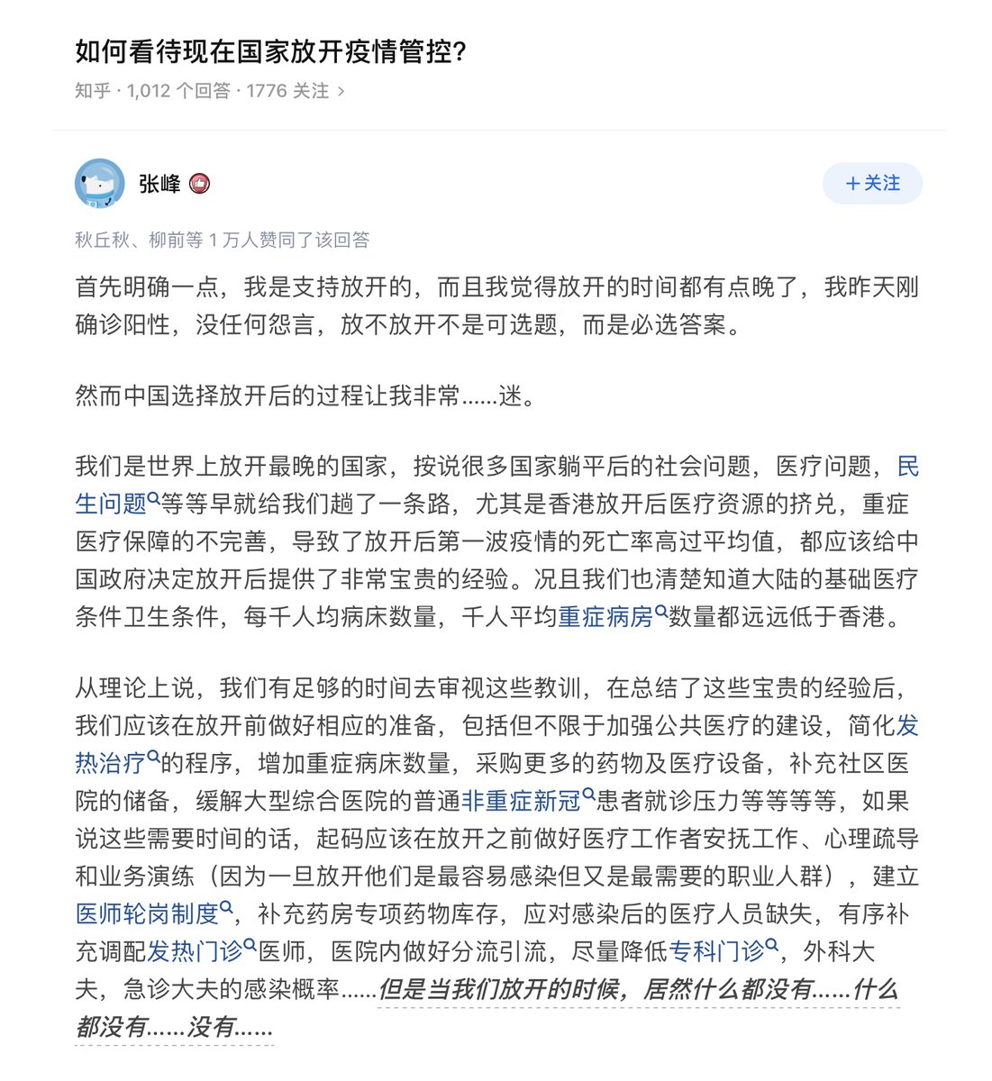 知乎上一篇获得万赞的对中国放开后情况的总结,可以代表不少人的心声。最后一段话似乎在狠狠讽刺当今圣上😆