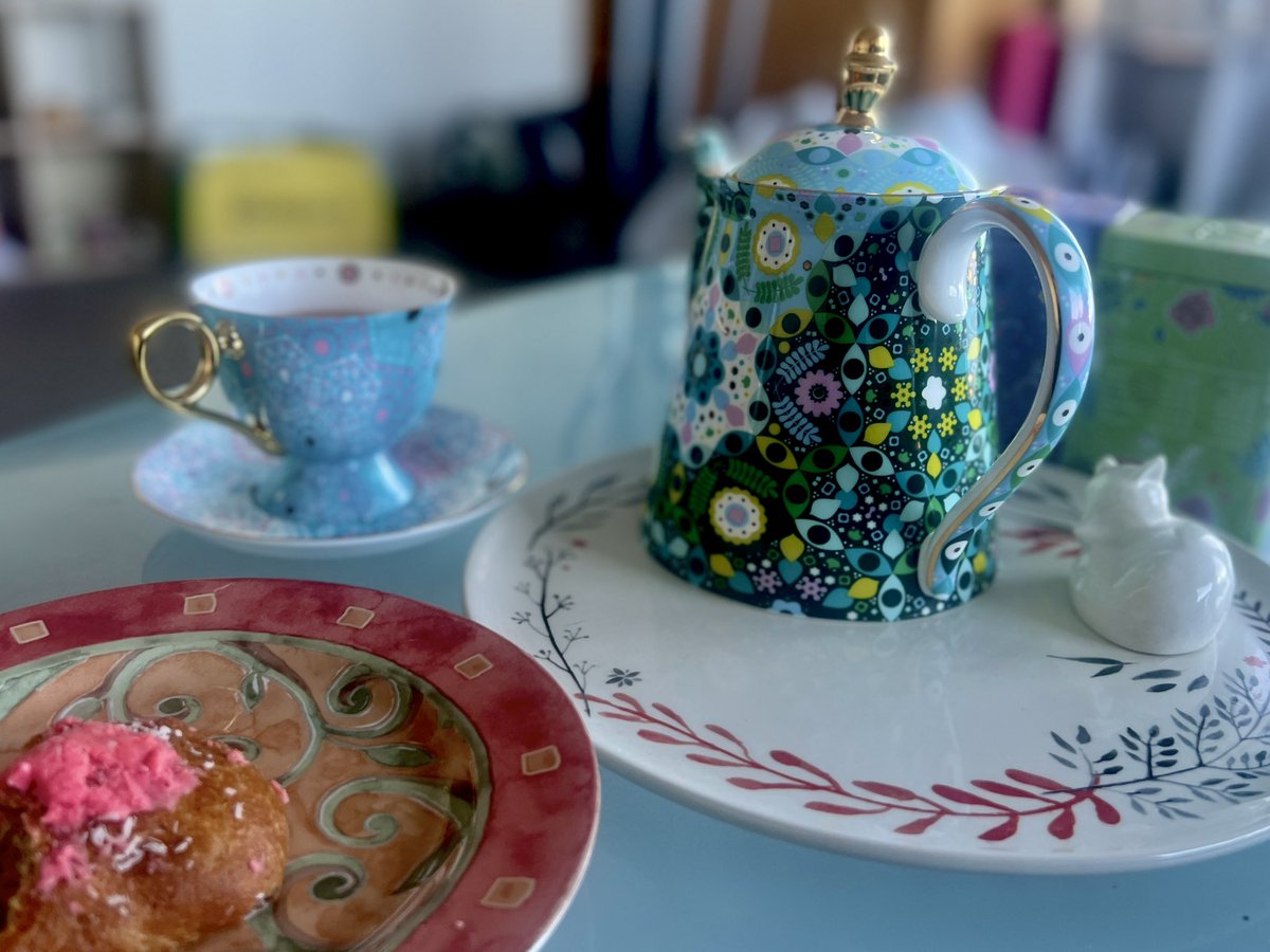晚上七点半的窗外。那艘小帆船很惬意。从友人()那里得到了一堆好看的盘子。非常感谢。我有一种已经在此地住了很久的错觉。