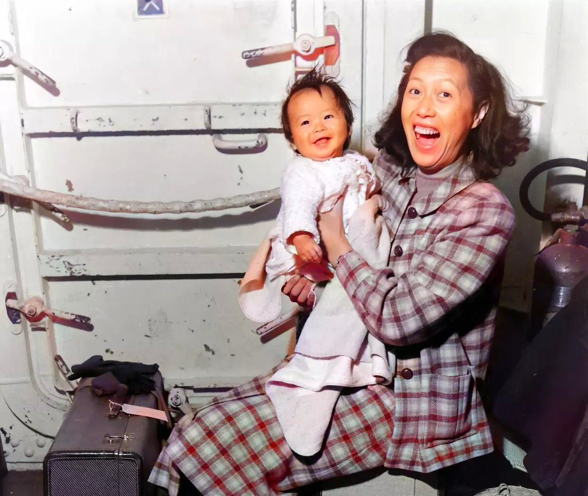 1949年4月,上海解放前夕,大批上海人拥挤上轮船逃离上海,当时一票难求,很多时候只有金条才能得到一张船票。一个年轻的母亲抱着她的孩子终于费劲磨难才登上轮船,轮船起航的那一刻,这对母女开心地笑了。