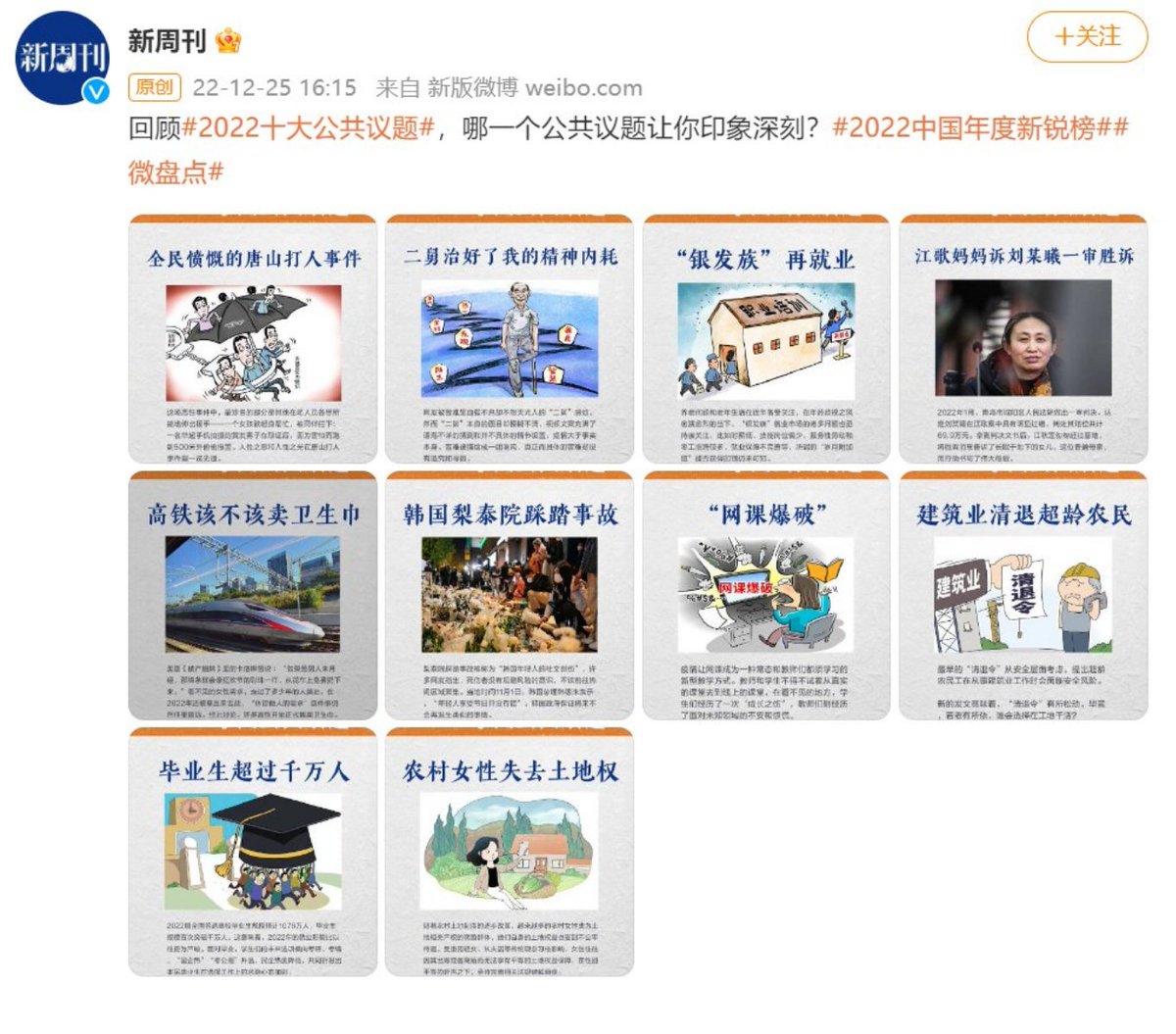 看了一下新周刊的2022十大公共议题评选,只能说确实已经是在能说的范围内选了十个话题了。不如推特上也做一个2022十大中国公共议题的评选