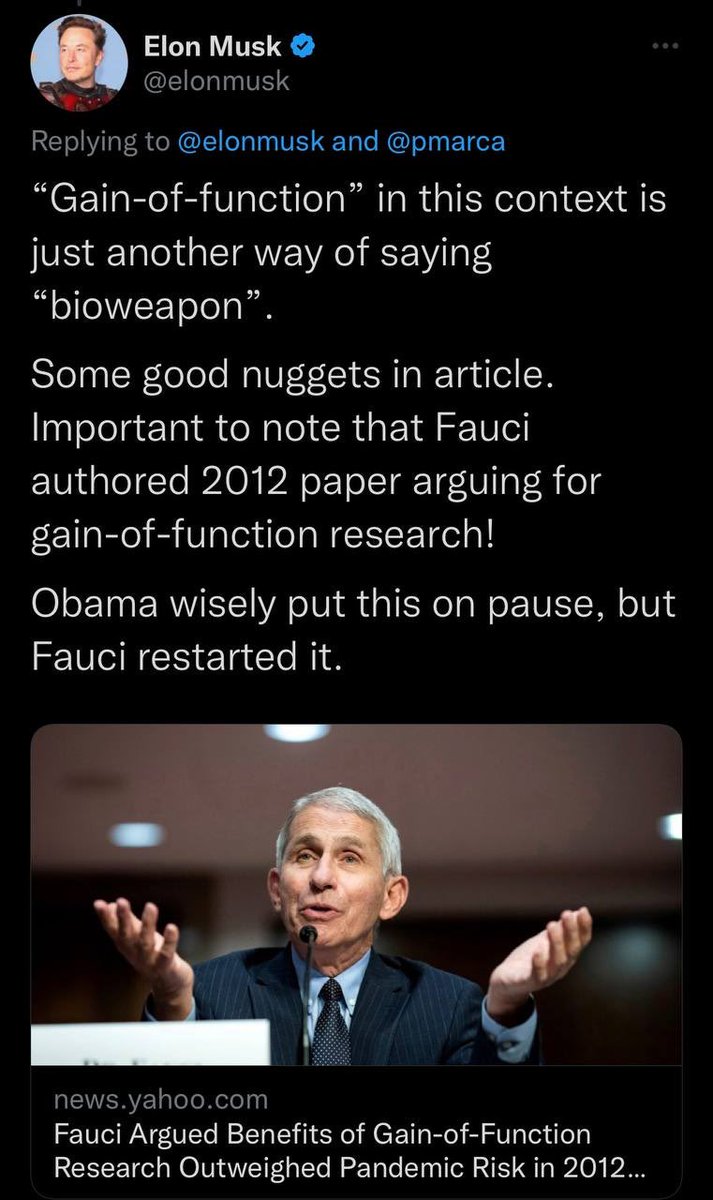 马斯克已经开始揭露福奇医生开发生化武器。他老婆还是负责监管他的部门的头。