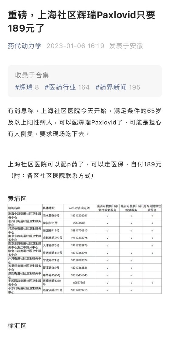 网友投稿,上海社区医院今天开始面向65岁以上的阳性患者提供辉瑞Paxlovid,可走医保,自付189元。为防止倒卖,要求现场吃下去。