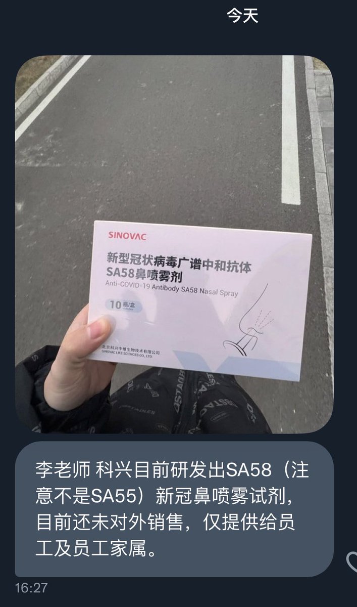 网友投稿科兴目前研发出SA58(注意不是SA55)新冠鼻喷雾试剂,目前还未对外销售,仅提供给员工及员工家属。