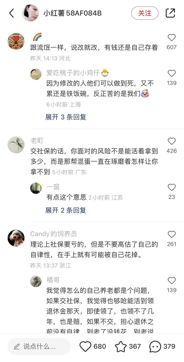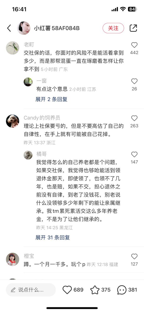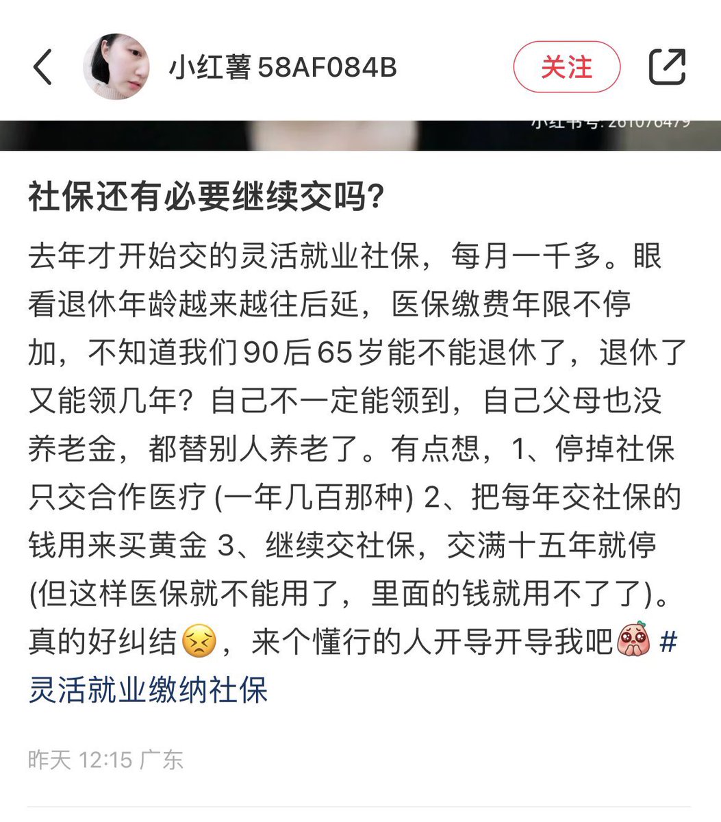 小红书上一个关于社保的帖子中国政府的信誉其实已经破产了,口头上爱国容易,很多时候真到花钱的时候就看出来了