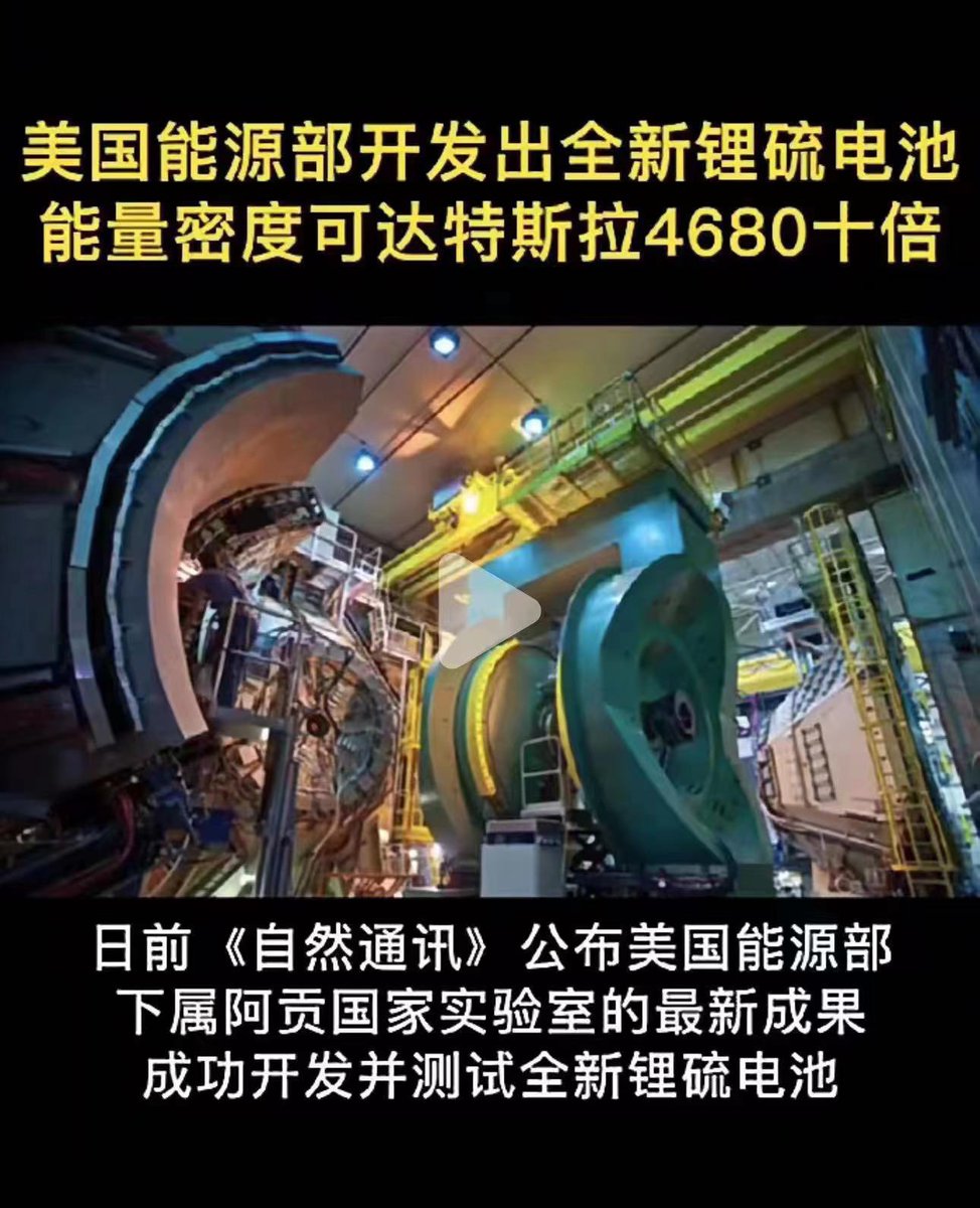 转发:美国能源部开发出锂硫电池,能量密度是特斯拉的4680倍。啥意思,就是充一次电可以开10年车?如果真是这样,这个世界将发生巨大的变化🤔🤔