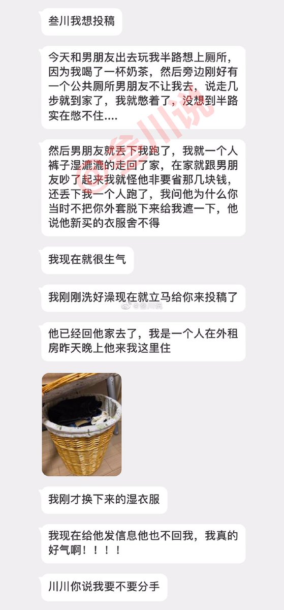 男朋友不想出钱让她上公厕说忍着,结果尿裤子里了……简直了,身体不是自己的,脑子也不是自己的,还要投稿问人该不该分手