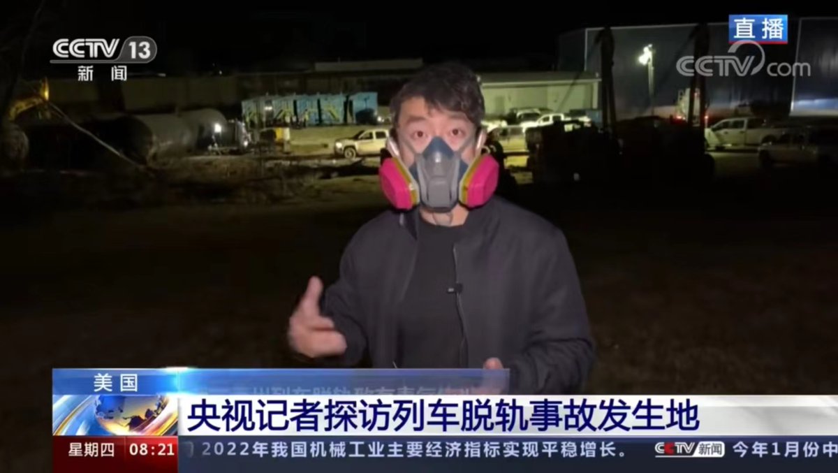 央视虽迟但到,在俄亥俄事故现场挑了一个夜晚(本推下一条可能能部分回答这个问题)进行报道。记者戴着很奇怪的东西。