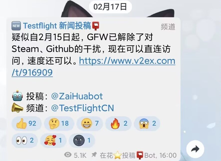 疑似自2月15日起,GFW已解除了对Steam、Github的干扰。