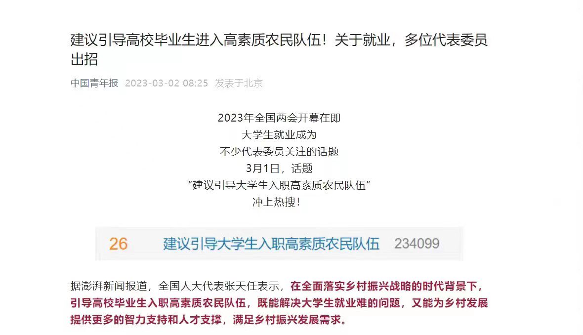 网友投稿中国青年报3月2日的文章,建议引导高校毕业生进入高素质农民队伍