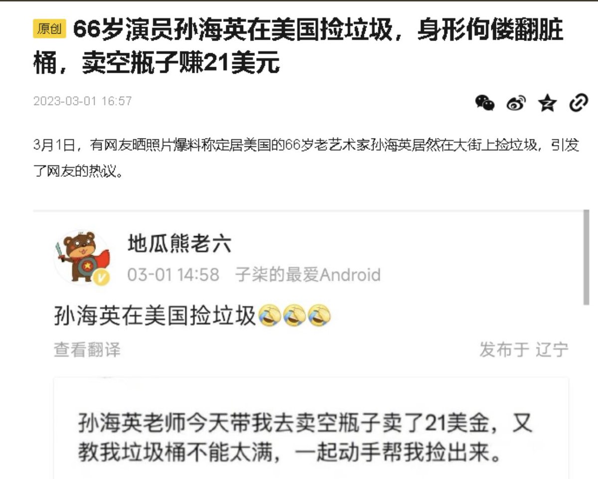 孙海英的政治立场另当别论,这个地瓜熊老六这么造谣还要不要点脸?事实是孙帮助两位华人同胞移民整理垃圾箱。到地瓜熊这里就变成了穷困潦倒。人再穷也不会遭人鄙视,像地瓜熊这种谣言贩子才令人鄙视。