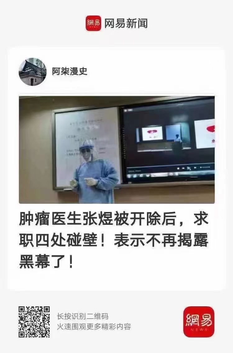揭露医院黑幕的微博大V张煜医生被开除,没有医院再就业。当下的中国就是这样,把善良赶尽杀绝,对恶人百般放纵,以至于路不扶人,器官为货,当街杀人视若无睹,压榨百姓没有底线,地狱无非如此……