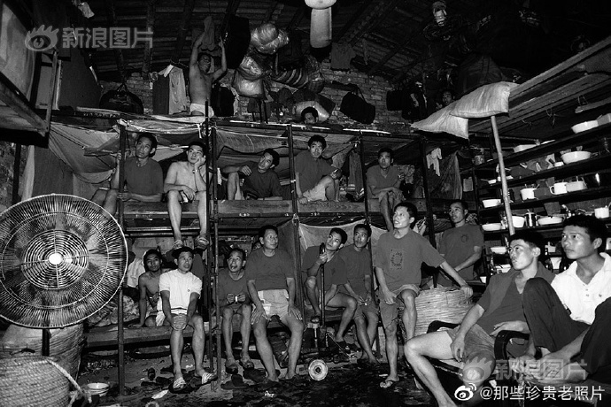 1995年,广东广州,搬屋工人在宿舍看电视。在当时的户籍政策下,农民外出打工必须持有身份证、务工证、暂住证,否则会被以“三无人员”遣返回家。他们在用自己的努力争取生存空间,非常艰难。
