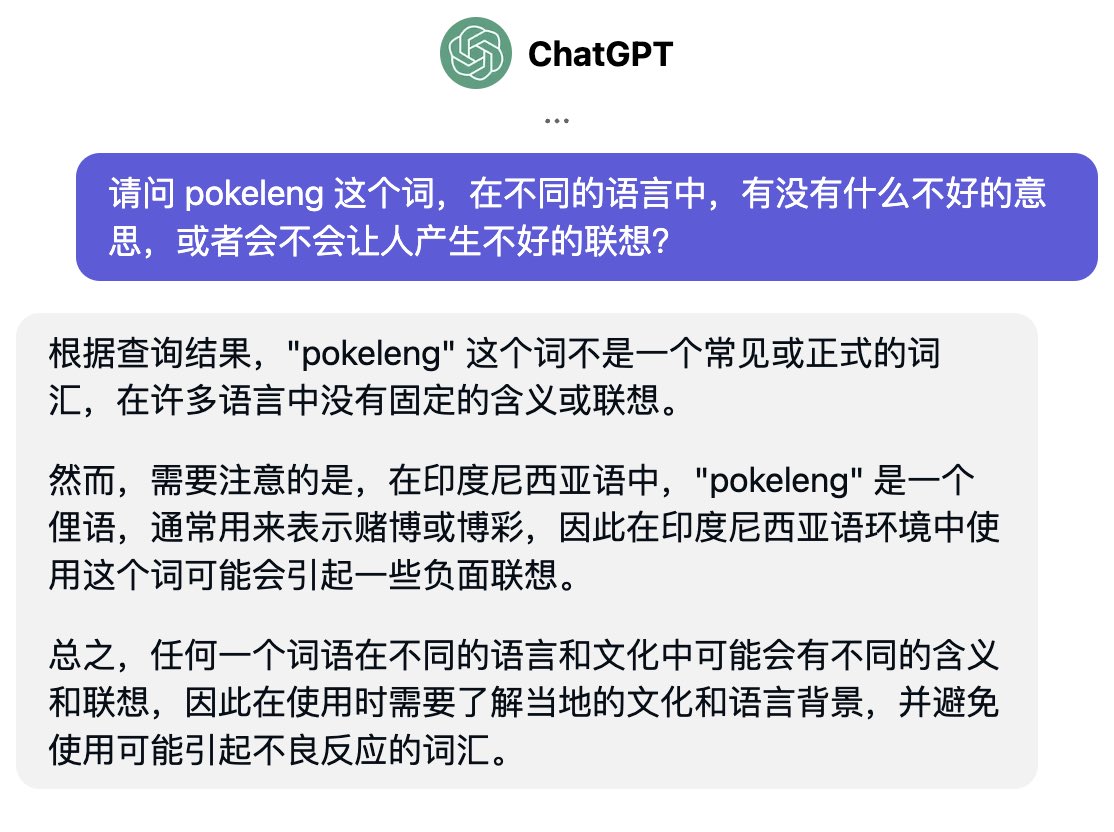 GPT 强大翻译功能的一种用法:给产品取名时,用它查一下这个词在不同的语言中是否会有负面含义或者会让人产生不好的联想,防止踩坑。😶
