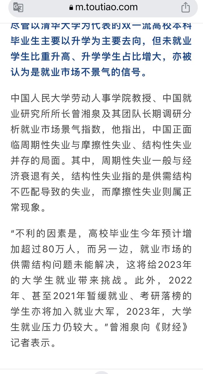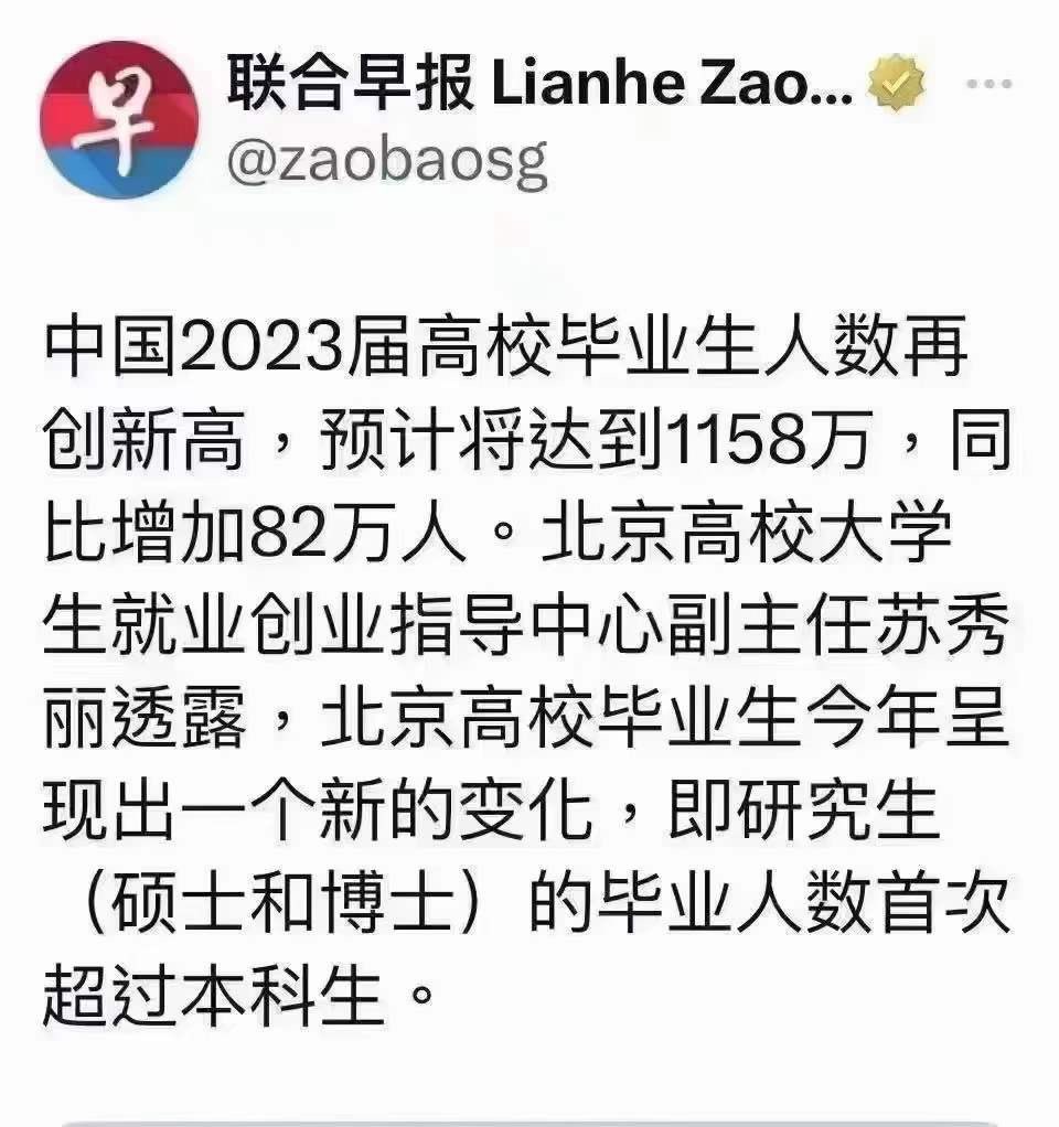 2023年大学毕业生超过1150万,4年大学两年网课,一毕业就遭遇经济下滑,外企撤资扯企,面临就业压力。另外北京硕士博士毕业人数超过本科生。央视不要怪学生脱不下长衫,学生也不要恨社会残酷,因果轮回,求仁得仁。