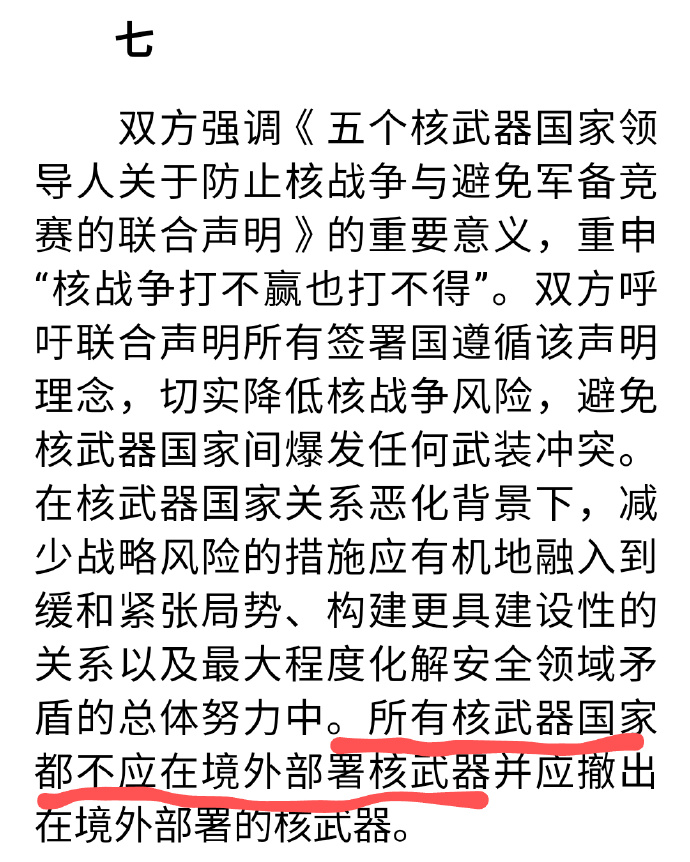 “3月21日中俄两国元首联合声明第七节:所有核武器国家都不应在境外部署核武器。3月25日俄新社:俄罗斯将在白俄部署战术核武器。”