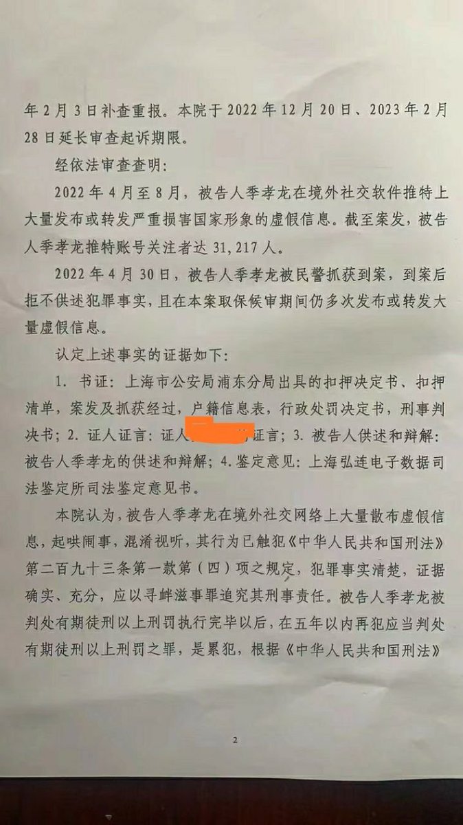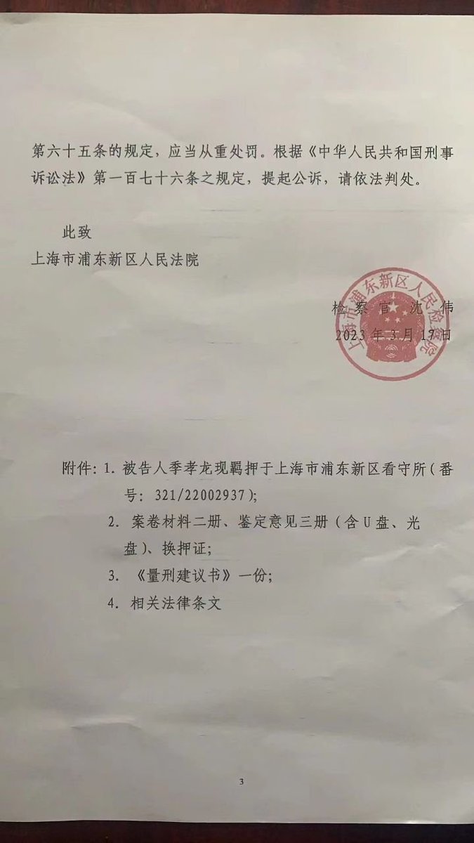上海市浦东新区人民检察院对季孝龙的起诉书