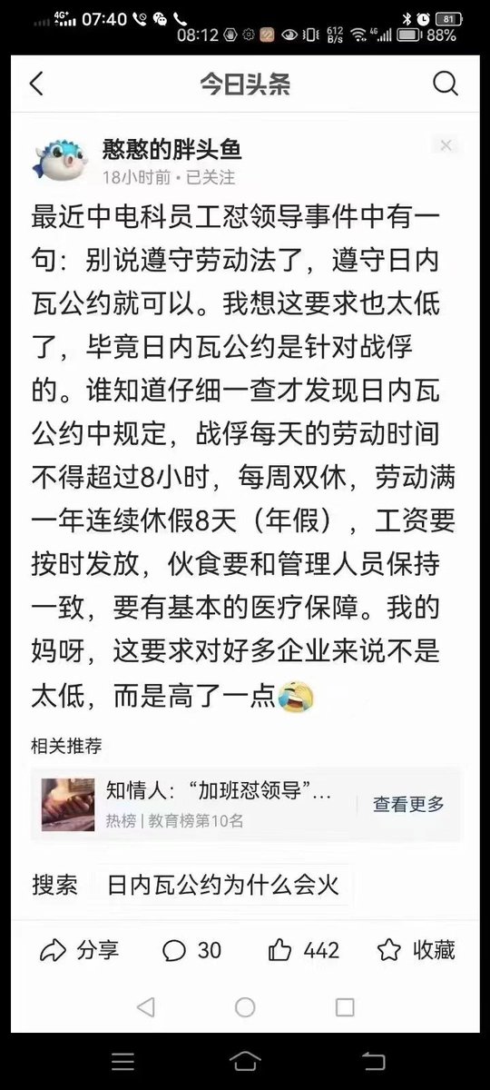 今日酷评【最近中电科员工怼领导事件中有一句:别说遵守劳动法了,遵守日内瓦公约就可以……】