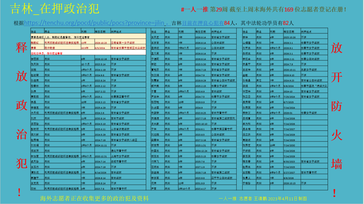 请方便加入 #一人一推 的海外推友联系我🙏根据,;统计 ,吉林目前在押良心犯有84人有主推推友的:鞠殿红